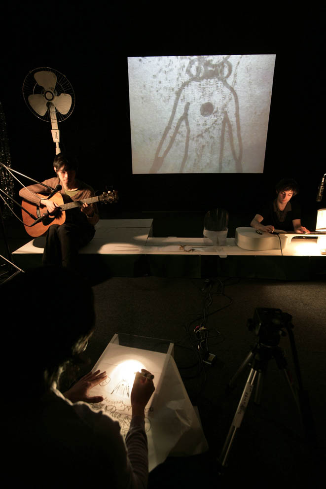 Drawing Video is derived from the three performances of pushing against the air. It comprises the same content of telling scary stories on three different dates. In this video, a voice tells a series of scary stories while drawings are being made. scary stories were loosely connected to both a) the rest of the performance and b) the general theme of in the room series: safety and comfort of having boundaries versus the horror of dissipation of those boundaries, manifested through co-habitation, contact, communication, teaching, resemblance, haunting, aging, and murder.