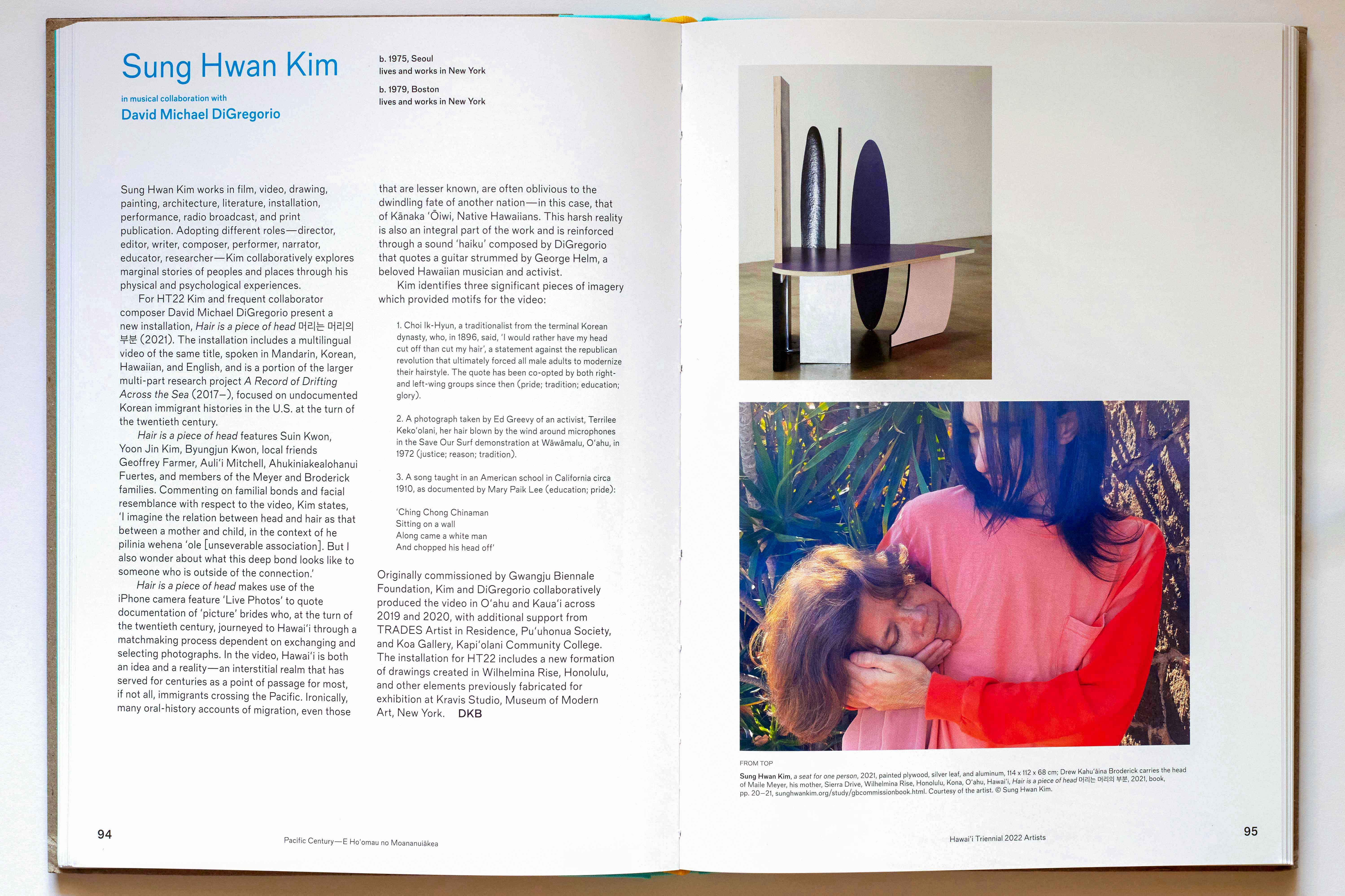 Broderick, Drew Kahu‘āina, "Sung Hwan Kim in musical collaboration with David Michael DiGregorio," Hawaiʻi Triennial 2022, catalogue, 2022, p94-95