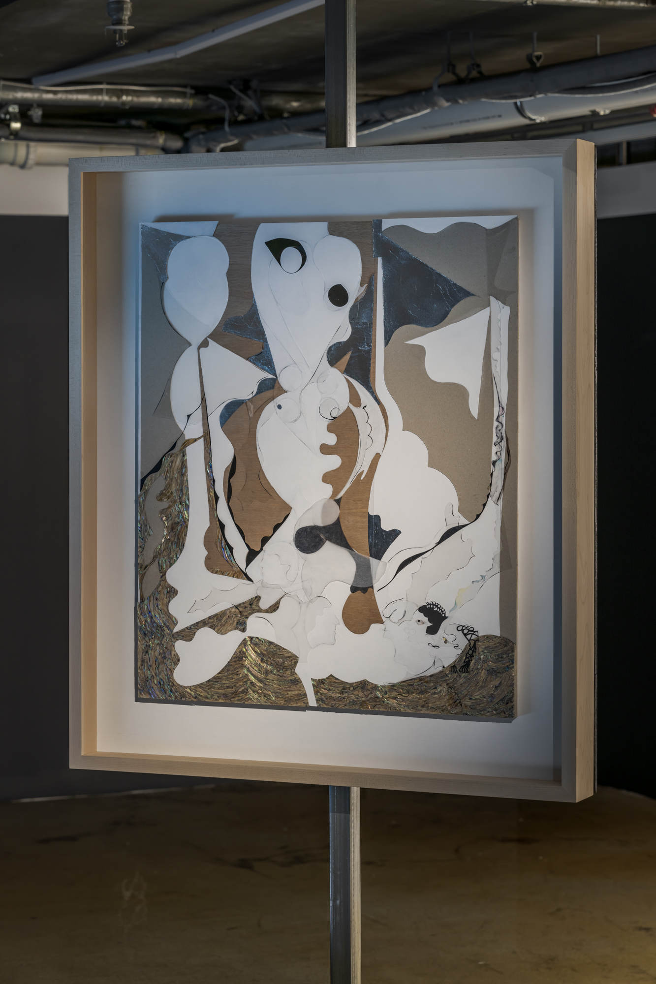 Howl Howl, 2022, Pencil, acrylic paint, water-based poster paint, oil-based poster paint, tracing paper, Bristol paper, mounting board, acetate sheet, hinging tape, document repair tape, double-sided tape, acetate tape, glue, abalone sheet, 104.6 × 91 × 8.5 cm incl. frame; courtesy of Artist (photo credit: Jeon Byung Cheol, *Suin Kwon)