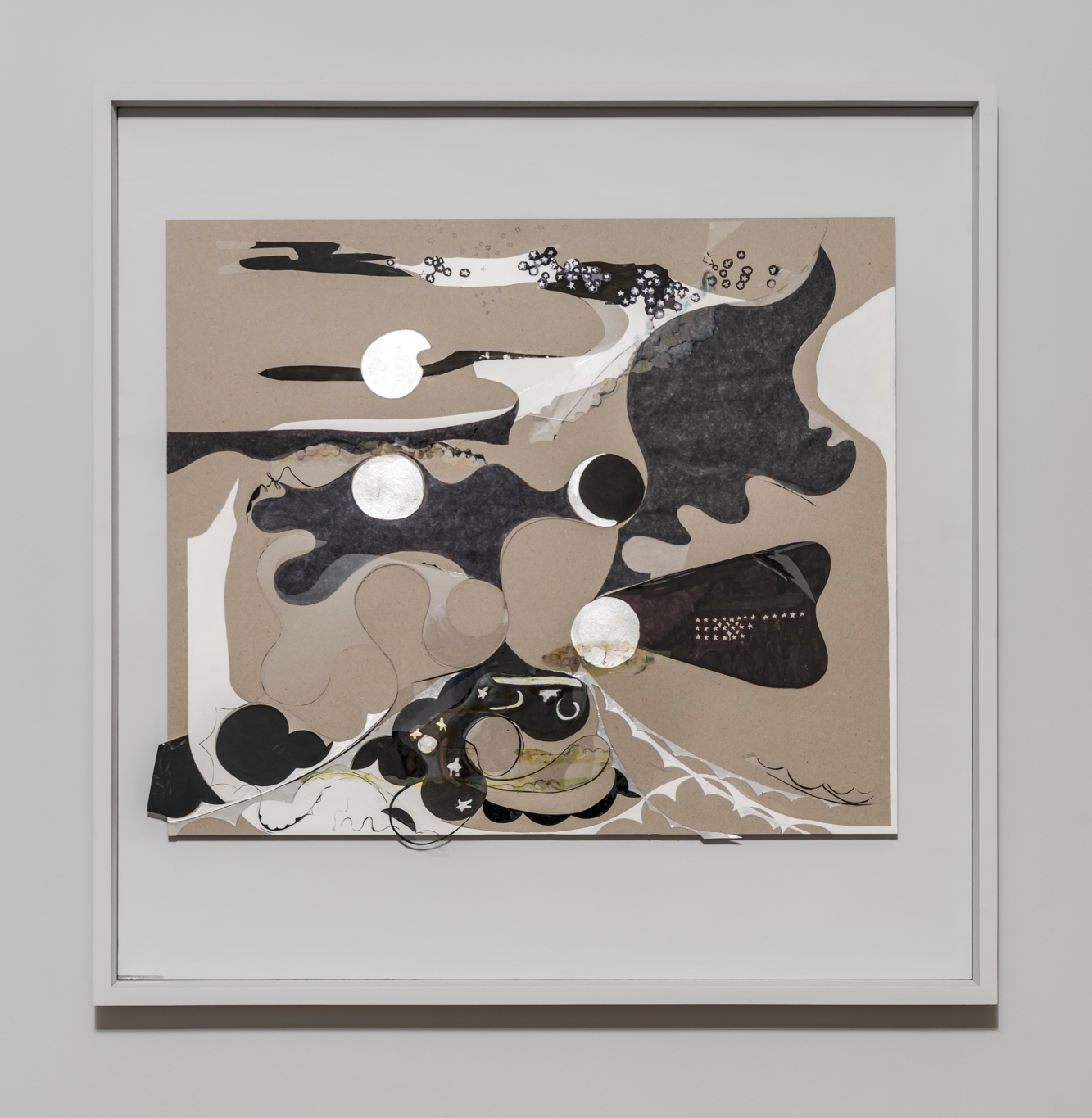 Night Crazing 01, 2022, Pencil, acrylic paint, water-based poster paint, oil-based poster paint, tracing paper, Bristol paper, mounting board, acetate sheet, aluminum tape, hinging tape, document repair tape, double-sided tape, acetate tape, glue, 96 x 98 x 2.6 cm (100 x101.9 x 8.5 cm incl. frame); courtesy of Artist and Barakat Contemporary (photo credit: Jeon Byung Cheol)
