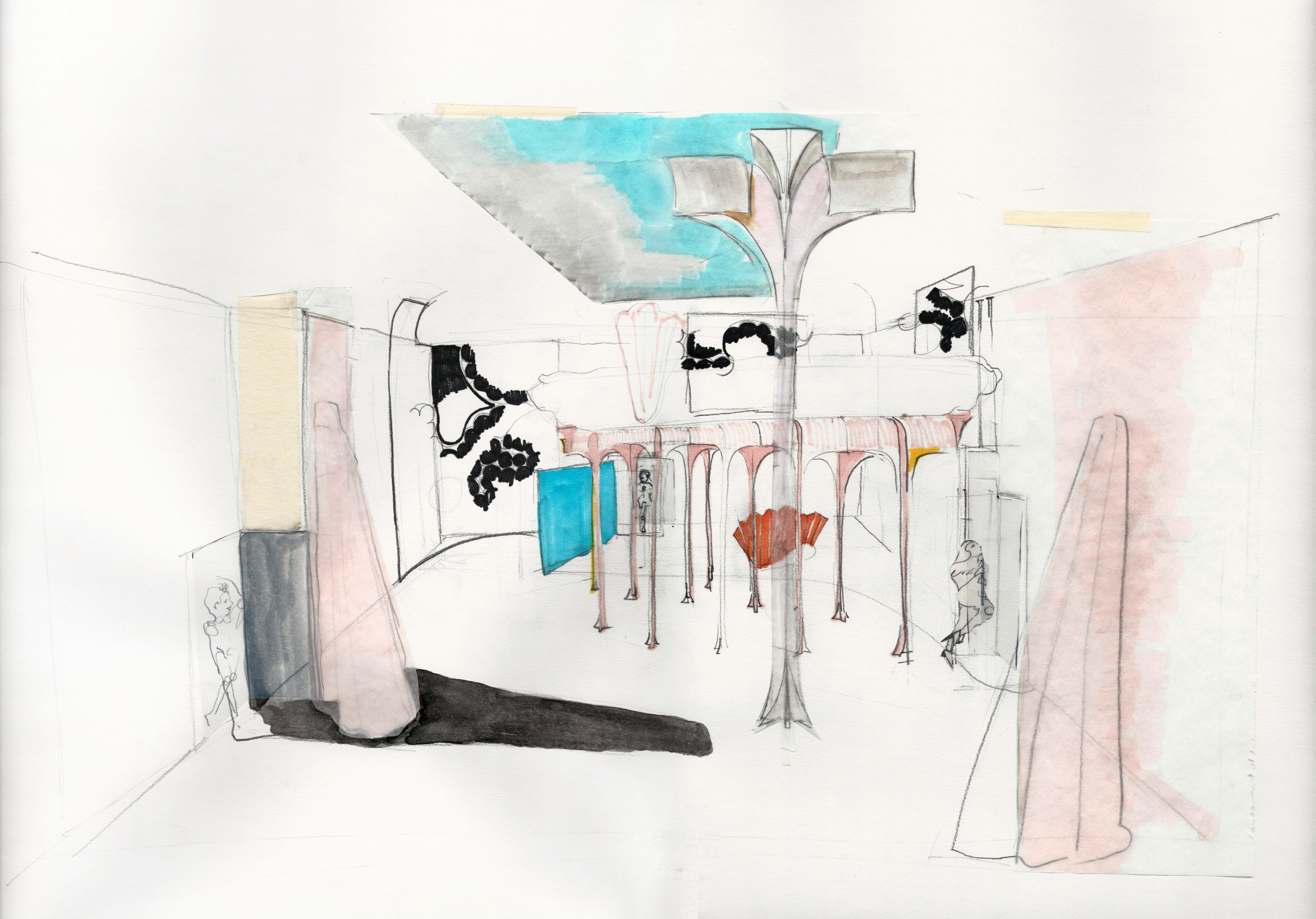 production sketch for Love before Bond, 2016, Acrylic, pencil, marker and tracing paper on paper, 45.5 x 61 cm; courtesy of Artist (SHKIM16DW008)