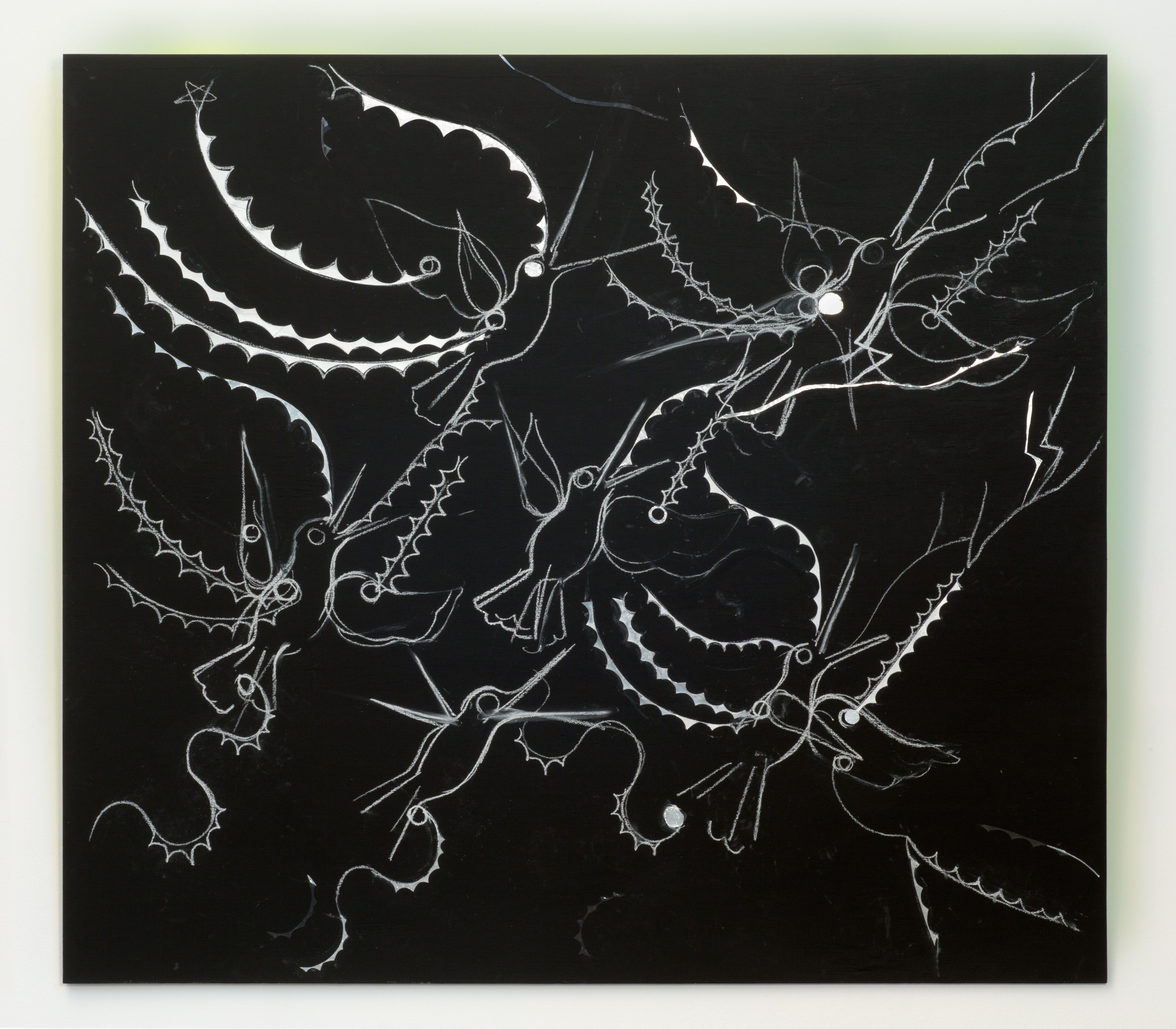 six birds through lightning, 2016, Chalk, acetate, tape on blackboard, 114 x 127 x 7 cm; courtesy of Artist (SHKIM16DW007)