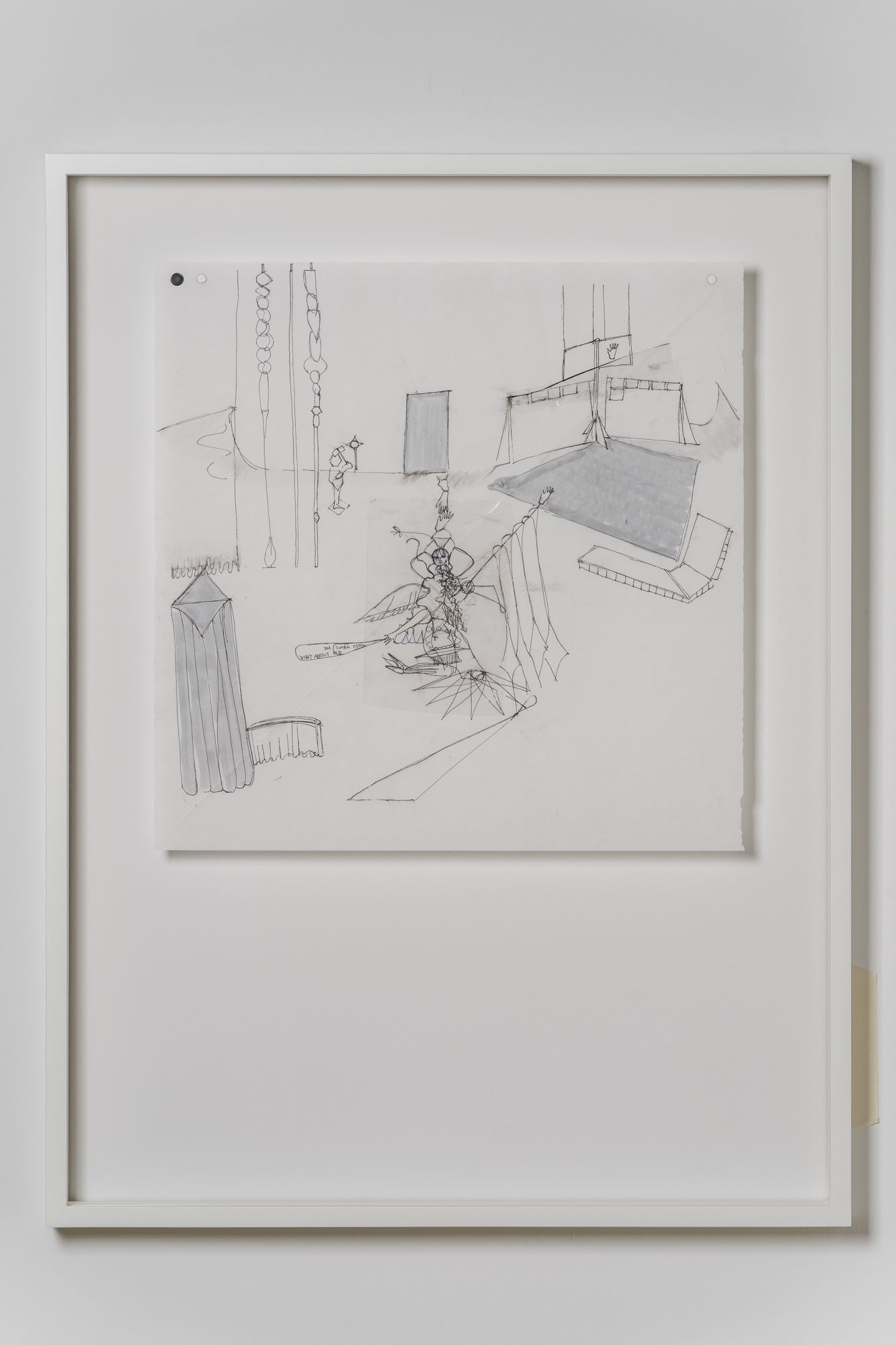 Untitled [what about me], 2011, Parchment paper, paper, acetate sheet, pen, pencil, water-based poster paint, oil-based poster paint, acetate tape, nail, push pin, 88 × 66 × 5 cm incl. frame; courtesy of Artist (photo credit: Jeon Byung Cheol)